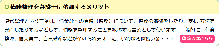 債務整理とは、法律を用いて借金等の返済負担を軽減する手法の総称です。大きく分けて、①任意整理、②個人再生、③自己破産の3種類があります。任意整理は、裁判所を通さずに、貸・・・