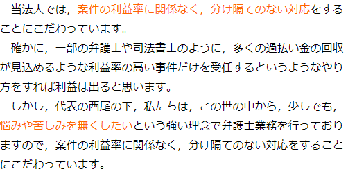 弁護士法人心では、任意整理、自己破産、個人再生について、成功報酬金は原則としていただいておりません。