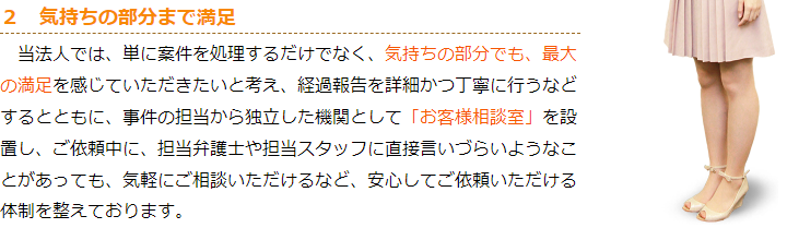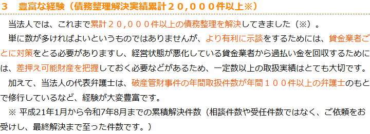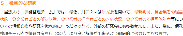 当法人は、債務整理を集中的に取り扱う弁護士を決め、同じ期間でより多くの経験を積めるようにするとともに、当法人のそうした弁護士同士で情報交換や研修等を行い、より多くの情報やノウハウを獲得できるようにしています。